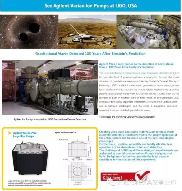 LIGO使用多公里尺度引力波探测器时需要超清洁和稳定无振动运转的高真空环境以保证系统的正常运行。安捷伦设计和建造了特别定制的离子泵,为这个实验提供了成功理想的真空条件。