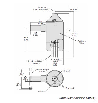 安捷伦 563 B-A 型热阴极电离规管采用加热灯丝作为电子源。该规管在 2 x 10-10 至 1 x 10-3 torr 的压力范围内具有卓越的性能。玻璃壳体内部使用铂涂层,可以在较低压力下为真空规提供静电屏蔽,同时又可释放高压下可能积聚的静电。此外,还提供在低于 5 x 10-6 torr 真空下的校准规,用于测试真空规控制器。